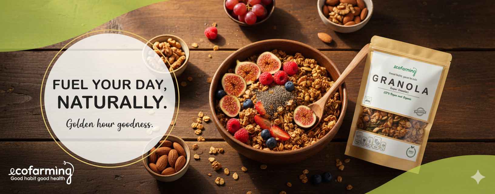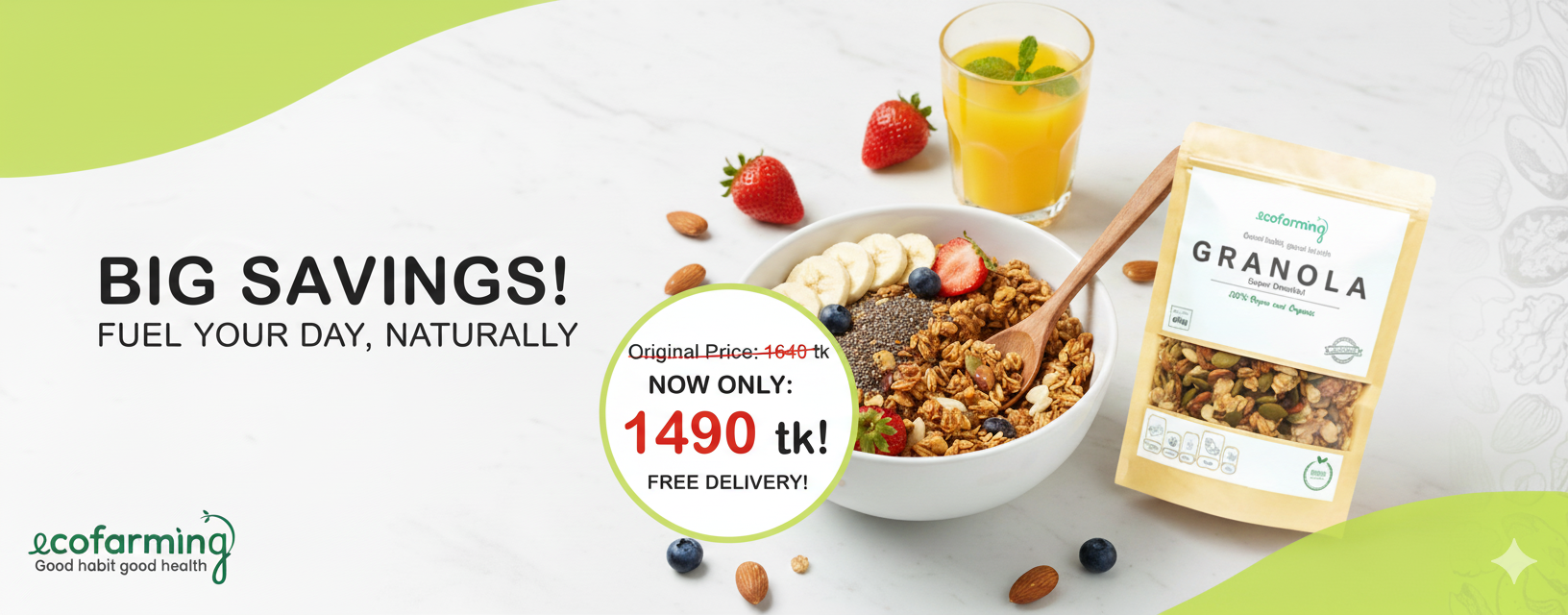 গ্রানোলা তৈরি হয় প্রিমিয়াম উপকরণ দিয়ে—রোলড ওটস, বাদাম (আলমন্ড, পেস্তা, আখরোট, চিনাবাদাম), কুমড়োর বিচি, খাঁটি মধু, কিশমিশ (কালো), ও ঘি। কোনো কৃত্রিম সংযোজন নেই।